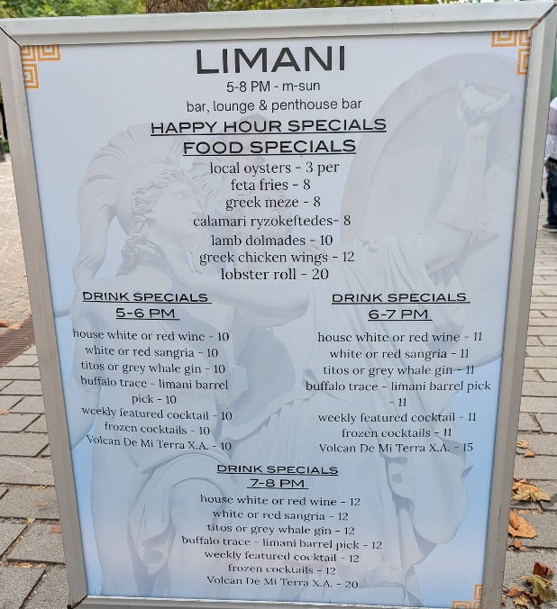Limani is open on Monday from 5:00 PM - 10:00PM; Tuesday, Wednesday and Thursday from 12:00 PM - 10:00PM; Friday from 12:00 PM - 11:30 PM; Saturday from 11:00 AM - 11:30 PM; Sunday from 11:00 AM - 10:00 PM.