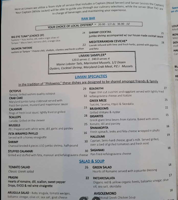 Welcome to Limani, where the art of Mediterranean cuisine meets the elegance of fine dining. Located along the vibrant waterfront in Washington, DC, we specialize in serving exceptional seafood-focused dishes crafted from the finest ingredients. From our signature seafood platters to flavorful Greek and Mediterranean delicacies, every dish at Limani is designed to delight your taste buds. Whether you're here for a special occasion or a memorable dining experience, we invite you to explore our menu and enjoy the best of Mediterranean cuisine in a chic, spacious setting. Visit Limani for an unforgettable meal today!