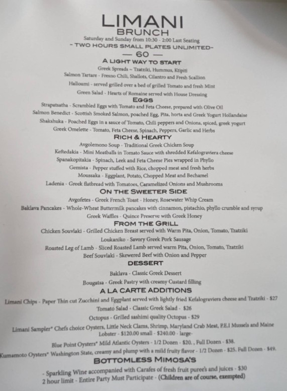 Limani is truly a gem! From the moment I walked in, the upscale atmosphere and beautiful design set the tone for a special experience. We were celebrating my sisters birthday and were lucky to be seated right by the waterfront, where the stunning view added an extra layer of magic to the day. We came for the $75 brunch, and I can confidently say it was worth every penny! The buffet was absolutely overflowing with high-quality dishes—from tender lamb and fall-off-the-bone ribs to crab legs, lobster tails, and perfectly cooked French toast. I definitely went back for seconds (and maybe thirds!). The dessert spread was just as impressive, with a delightful variety of treats. The mini cheesecakes and baklava were particular standouts—rich, flavorful, and the perfect sweet ending. Don’t skip the bottomless mimosas—the passion fruit flavor was our favorite! The hostesses were warm, attentive, and incredibly accommodating, making sure everything went smoothly from start to finish. Limani’s brunch is an experience I’ll absolutely be returning for. Elegant, delicious, and memorable in every way!